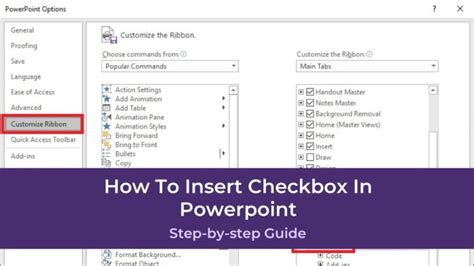 Powerpoint Insert Checkbox. Choose “customize ribbons” from the dialog box, scroll inside the “main tabs”. Web to insert checkbox in powerpoint, click on “options” from the “file” tab.